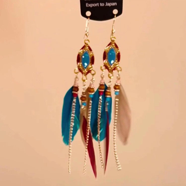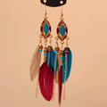 Bohemian Feather Earrings for Women – Vintage Tribal Fringe Dangle Earrings in Red & Blue