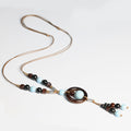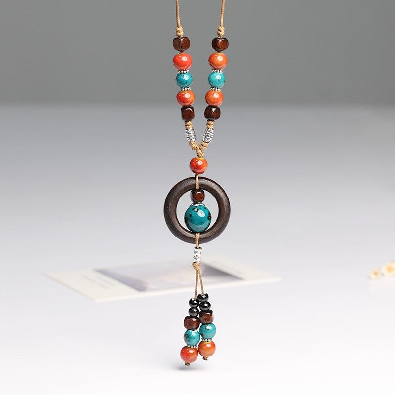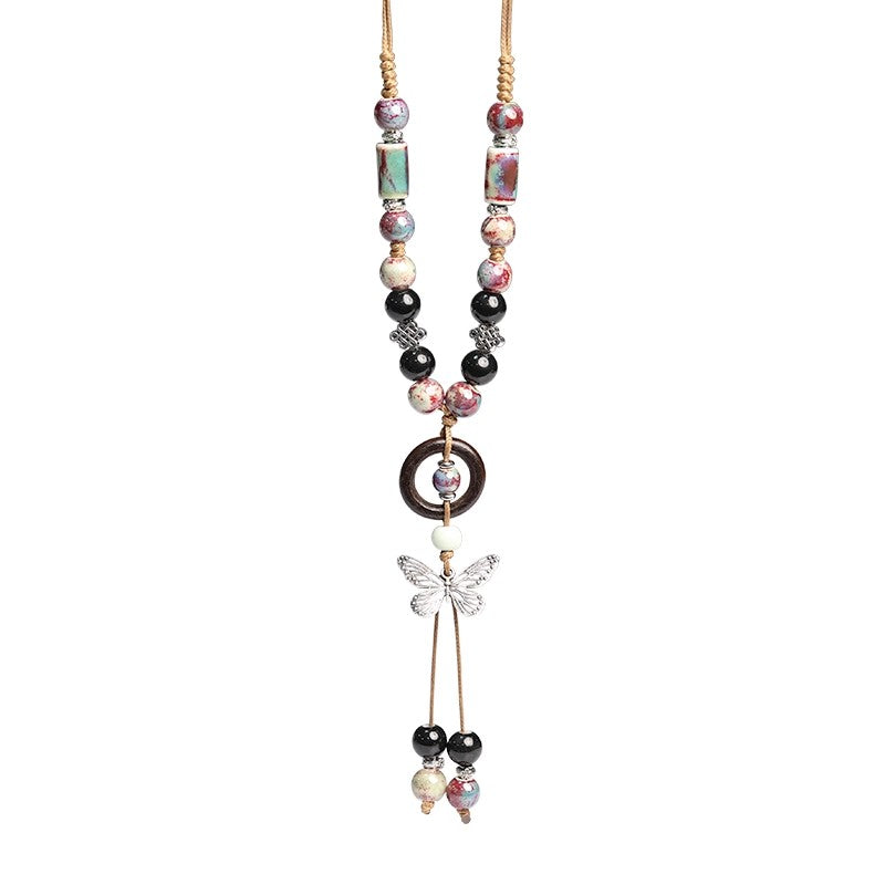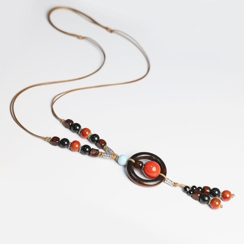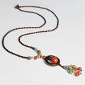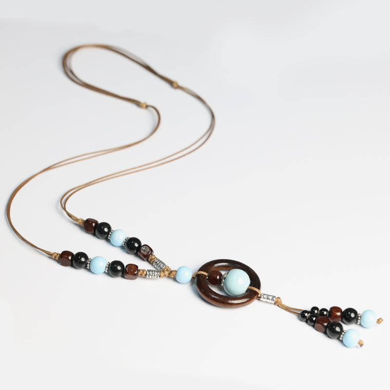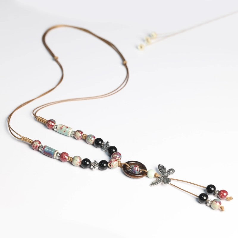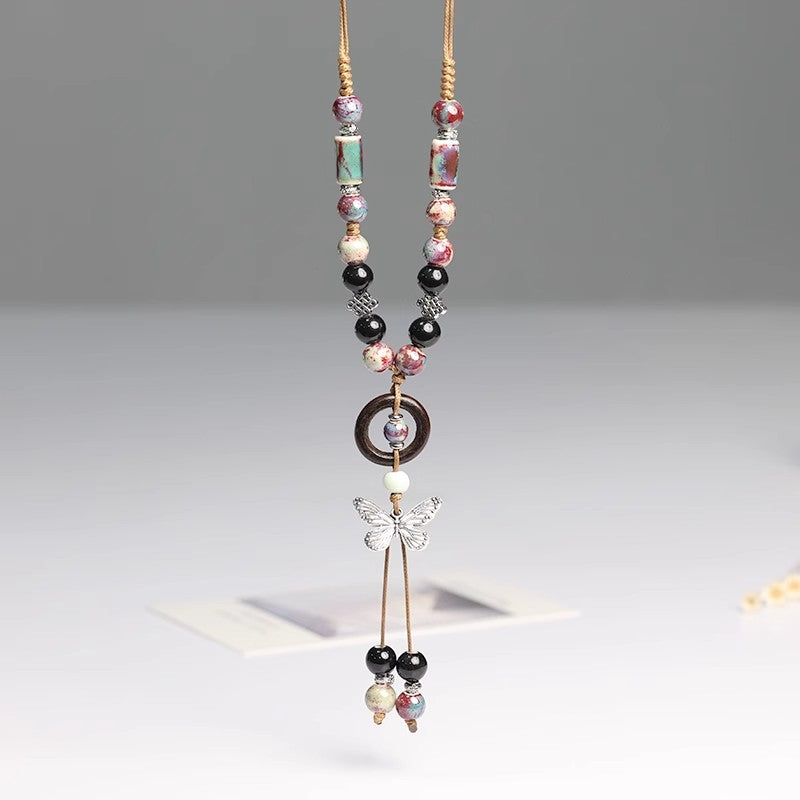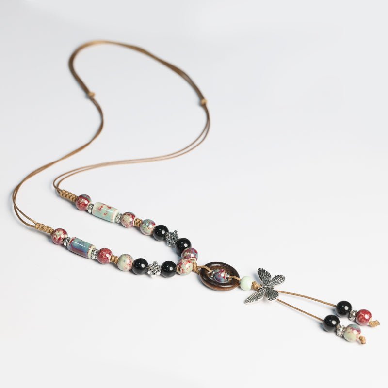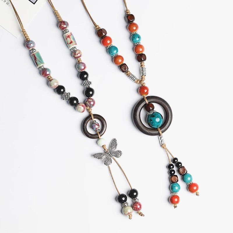 Handmade Jingdezhen Ceramic Necklace | Boho Ethnic Beaded Pendant Layered Chain for Sweater Jewelry